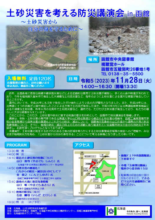 来る11月28日(火)、土砂災害や防災に関する知識の普及を目的として、北海道、(公社)砂防学会北海道支部の主催により「土砂災害を考える防災講演会in函館」~土砂災害から自分の身を守るために~と題し函館市中央図書館視聴覚ホールで講演会が開催されます。