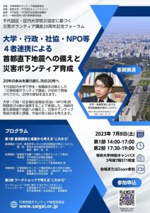 本フォーラムでは、大学・行政・社会福祉協議会(社協)・NPO等(民間団体)の4者が連携することで実現した、持続可能な首都直下地震への備えと、災害ボランティア育成の成果と課題、今後の取り組みを考えます。